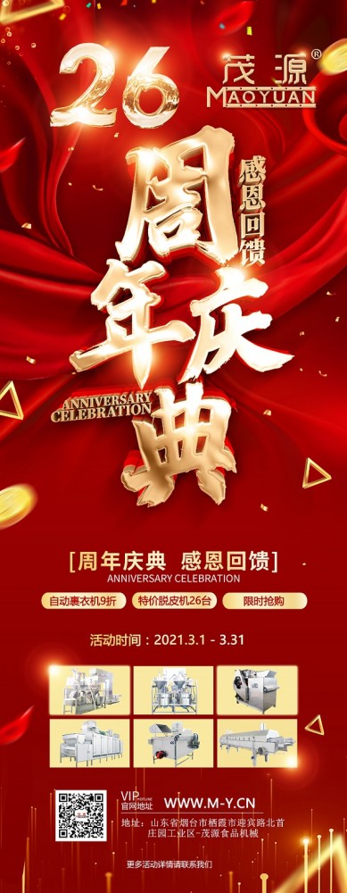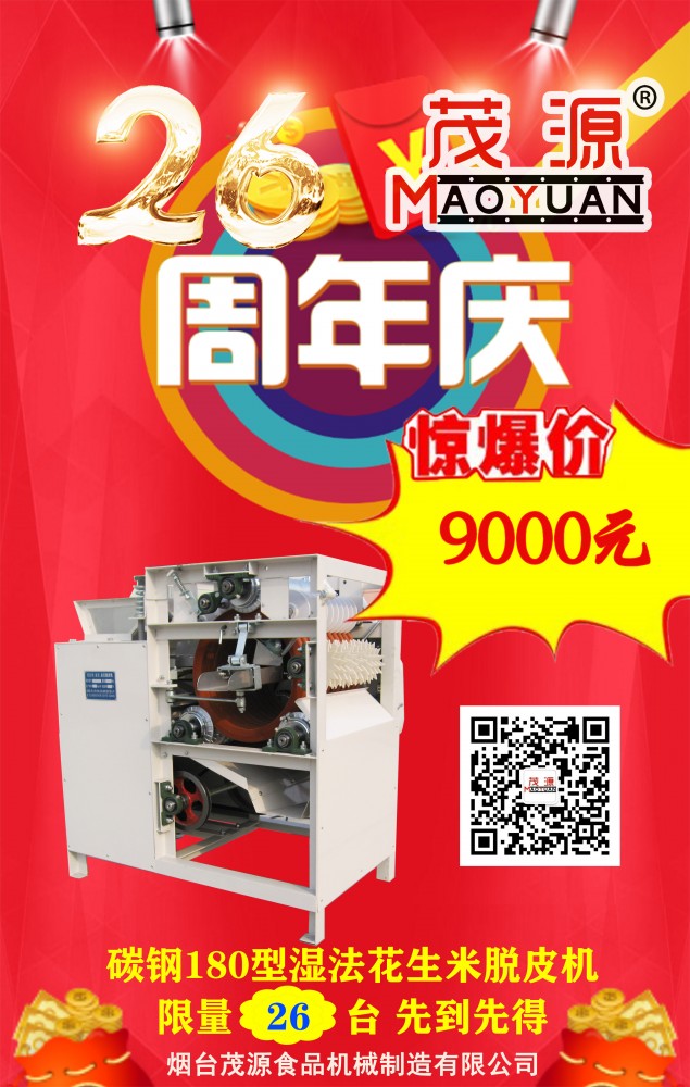 煙臺茂源食品機械即將迎來26周年慶,為感謝新老客戶長期以來的支持與信任,現(xiàn)特推出以下感恩回饋活動:單工位、雙工位自動裹衣機原價15.6萬元、25.6萬元基礎上降價10%,并隨機贈上料機;碳鋼180型濕法花生米脫皮機特價9000元,限量26臺,先到先得!