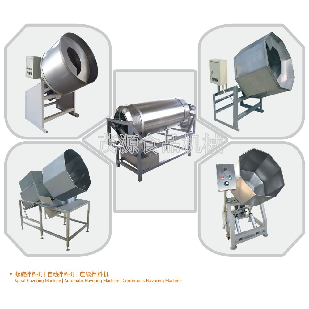 拌料機是與油炸生產過程中的其它設備配合使用,廣泛應用于油炸花生、蠶豆等顆粒物料與調味輔料的混合,也可應用于食品行業其他物料與添加劑的混合。該機拌料柔和、分散均勻、自動拌料、自動出料、操作方便,是適用于食品行業生產過程中物料混合的設備。 工作原理:進入拌料機內的食品原、輔料,在筒體運轉的作用下,靠筒體與物料(主、輔料),物料與物料之間的摩擦力及螺旋葉片的翻炒,相對運動、相互參合,從而達到主料與添加劑的充分混合,均勻粘附的目的。拌料完畢可實現人性化自動排料。